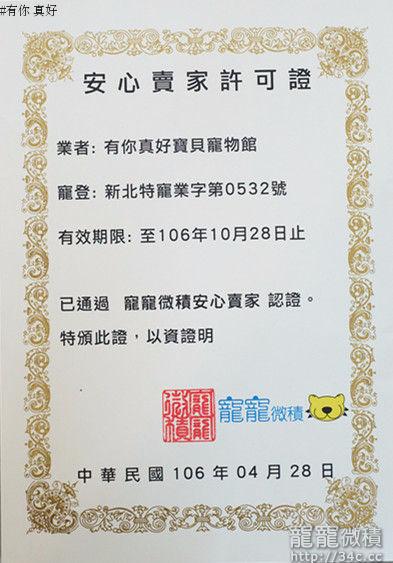 我們也會簽訂一份由農委會制訂的買賣定型化契約保固寶貝的健康喔 48小時發燒上吐下瀉肺炎5日病毒性傳染疾病180日先天性遺傳疾病 都在我們保固的範圍~我們都會負責到底! **新北寵登字號0532**